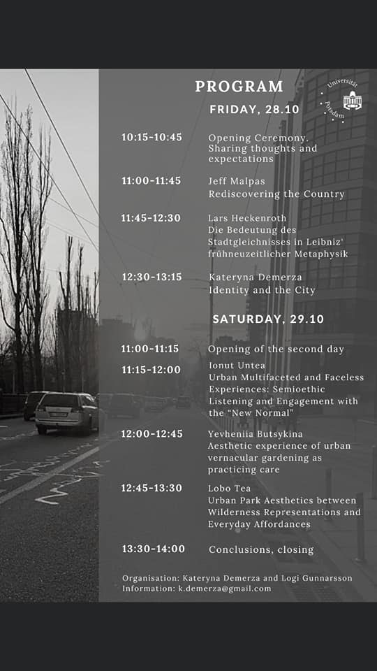 “Urban Park Aesthetics between Wilderness Representations and Everyday Affordances”, City: Everydayness, Identity, Aesthetics, Conference at University of Potsdam, 29 October 2022, online.